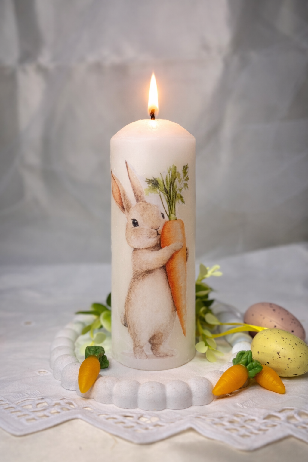 Vela de Páscoa em decoupage, com delicada ilustração de coelhinho que traz um clima doce e acolhedor para a decoração. Feita sem essência, é perfeita para quem prefere ambientes neutros e tranquilos. Um charme especial para celebrar a Páscoa com simplicidade e afeto.